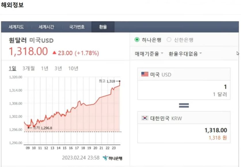 2. 25 새벽 환율이 다시 1,318원으로 폭등하였다. 여기서 알 수 있는 것은 금리로 물가를 잡을 수 없다는 확실한 팩트가 생긴 것이다. 환율은 여러 가지 재료에 따라 오르고 내리 고를 반복하고 있다. 2.23 한국은행의 금리동결 발표에 따라 당연히 환율은 올라가야 되는데 오히려 내려갔다. 이는 한국의 금리와 환율은 관계가 없다는 뜻이다. 우리나라 금리는 외국에게는 거의 영향력이 없다는 뜻이다. 그러므로 우리나라는 금리를 내려도 아무 상관이 없다는 뜻이다. 이것을 한국은행에서는 착각하고 있는 것 같다.