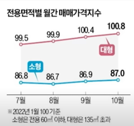 이번글을 마무리해보면 아파트 공급은 항상 절대공급(전체 가구수의 10%~20%) 가구 수 이상을 요구하고 있다. 그런데도 불구하고 고금리로 인한 매매 격감으로 아파트 공급시장 전망은 어둡기만 하다. 중소형 아파트는 매매가격지수가 떨어지고 있지만 대형(135㎡ 이상) 아파트는 오히려 매매가격지수가 올라가고 있다. 뿐만아니라 신고가도 계속 경신하고 있다. 그런데도 불구하고 대형아파트 공급 계획은 없다.