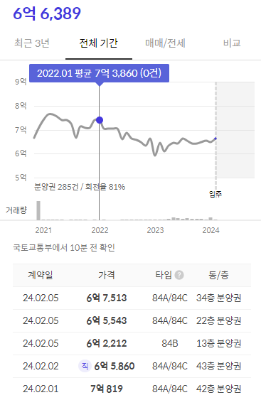 금년 1, 2월 매매가격을 보면 7억원에서 6억 원 후반대로 형성되고 있음을 알 수 있다. 대구지역 다른 아파트들 양상하 고는 너무나 다른 현상을 보이고 있는 것이다. 이것이 바로 부동산 임팩트 효과인 것이다.