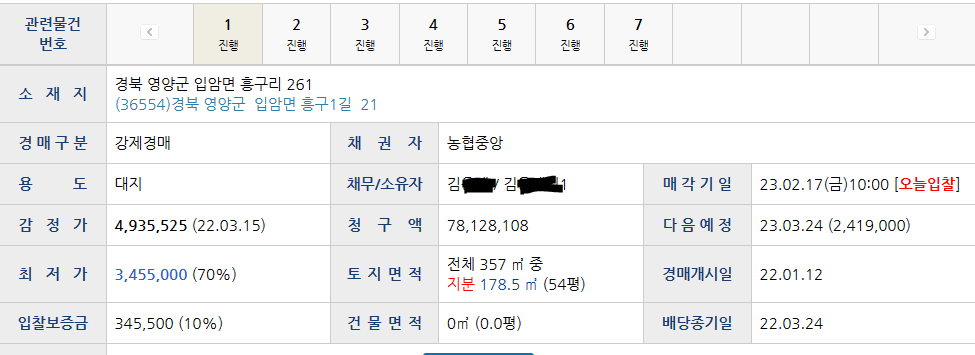 이물건의 물건분석을 해보면 이 물건은 경북 영양군 입암면 흥구리에 소재하고 있는데 사건 사진과 물건명세서를 검토한 결과 임차인은 대항력이 없고, 토지 공유자 김 00가 점유하고 있는 걸로 봐서 하자는 없는 물건이다. 그럼 이런 물건을 어떻게 접근할까? 요즘 농촌은 대부분 늙으신 부모니들만 지키고 있다. 김00가 어떤 사람인가부터 등기부등본 또는 임장을 가서 확인해봐야 한다. 등기부 등본을 확인해보니 소유자가 48년생이므로 75세 고령이다. 그러므로 김00가 연세가 많으신 분이기 때문에 분명히 자식들이 있을 것이다. 역지사지 입장에서 설득을 해보면 대부분 자식들이 십시일반 자금을 내어서 지분을 매수해 준다. 고령인 아버지를 다른곳으로 차마 이사를 가도록 하지는 않게 할 것이다