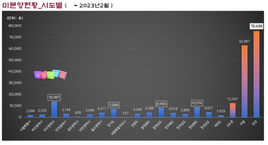 '23.2월 아파트 미분양이 10년 만에 최대인 7만 5천 호가 되었다. 어쩌면 미분양이 가장많은 대구가 기회다. 우리나라 아파트 미분양 한계선은 약 6만 2천 호가량이다. 그런데 이런 속도로 간다면 미분양 10만 호를 넘기는 것은 시간문제이다. 정말 심각한 문제가 아닐 수 없다. 이대로 둔다면 자금력이 부족한 건설사, 자재도급 회사들이 부도나는 것은 불을 보듯이 뻔하다. 또한 노동자들의 일자리가 엄청 많이 사라질 것이며 이는 사회적 문제로 대두될 것으로 예상된다. 아파트 미분양이 7만5천호로 10년 만에 최대가 되었다. 이러한 사태로 인하여 미분양이 가장 많은 대구가 오히려 기회의 지역이 되고 있다. 오늘은 아파트 미분양 원인과 대구가 기회다 와 관련하여 자세하게 다루어 보고자 한다.