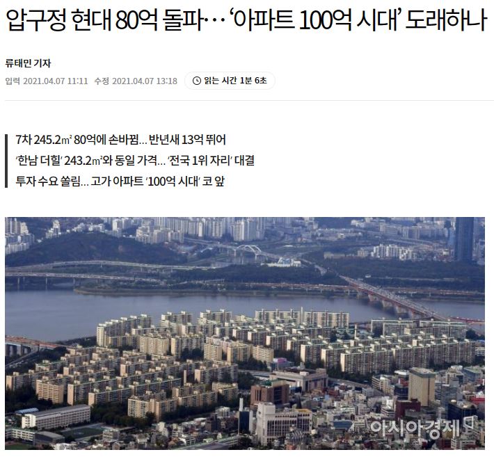 아파트 100억원 시대 도래