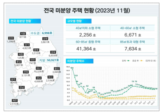 2023.11월 말 현재 전국 미분양 주택은 총 57,925호이다. 특히 포항시 같은 경우는 3,896세대로 구단위로 최대이다. 대구 같은 경우도 수성구, 동구, 중구 등 전 지역이 미분양 상태이며 미분양 가구수는 지난해 11월 현재 10,328호이다. 미분양 주택은 태영처럼 건설업 폐업, 부도 등으로 국민경제에 많은 영향을 끼치게 된다. 특히 현재 전국적으로 미분양 주택은 점차 늘어나고 있는 추세이다.